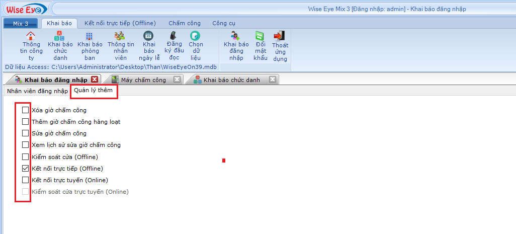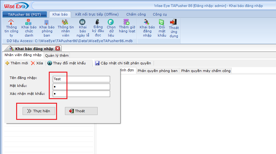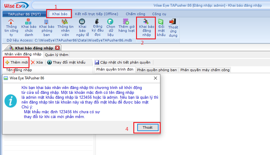 - Chú ý: khi tạo user đăng nhập, mặc định phần mềm sẽ tạo 1 admin có pass là 123456