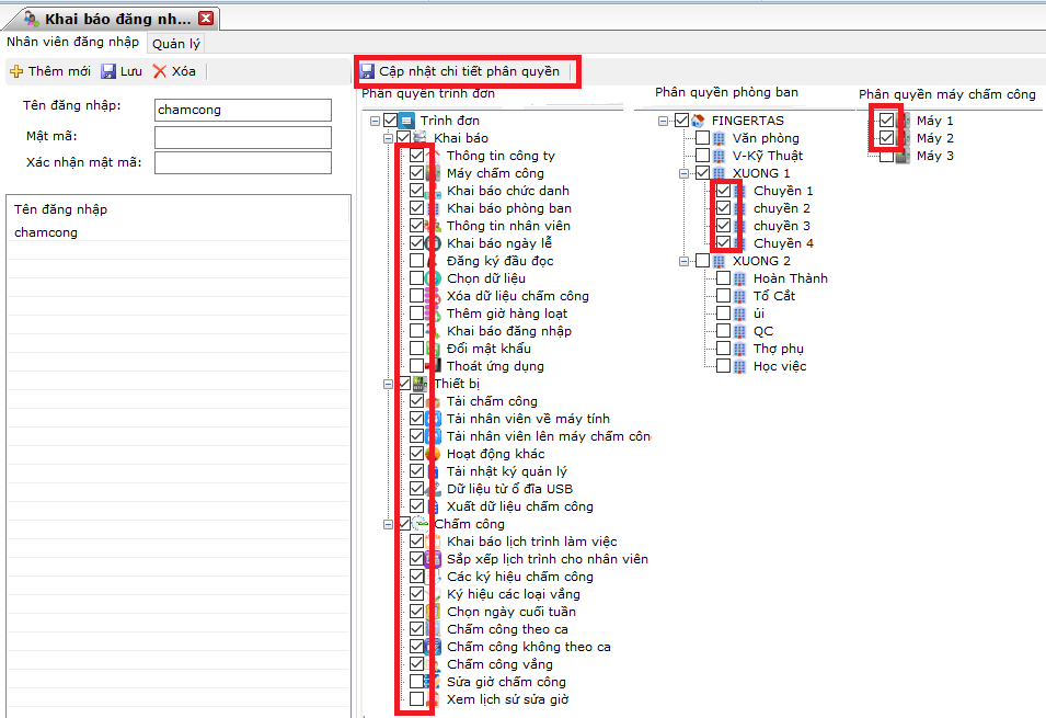 - Tích vào các quyền của user à bấm CẬP NHẬT CHI TIẾT PHÂN QUYỀN để lưu lại