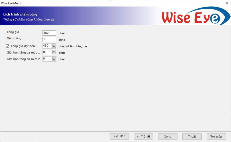 =>Giới hạn tăng ca mức 2 (phút) : khi thời gian tăng ca vượt quá thời gian quy định trong ô này thì số phút vượt quá sẽ đưa vào cột TC3