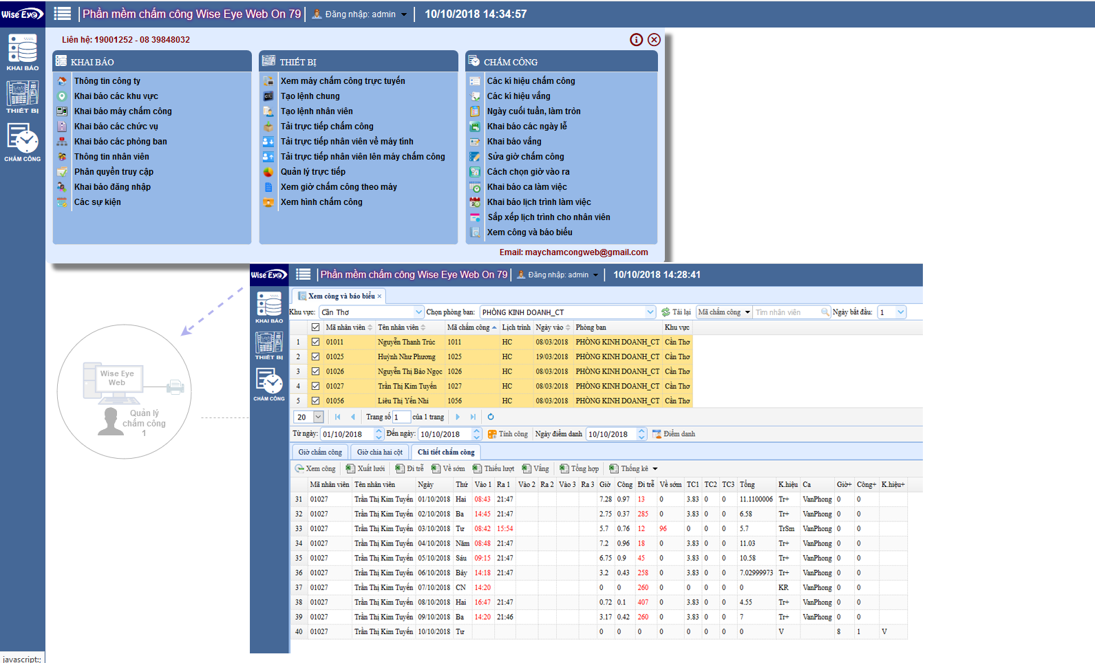 Phần mềm Wise Eye quản lý công dựa vào thời gian được ghi nhận từ máy chấm công. Chúng ta truy xuất bảng công theo mã của nhân viên, theo phòng ban và theo khoảng thời gian.