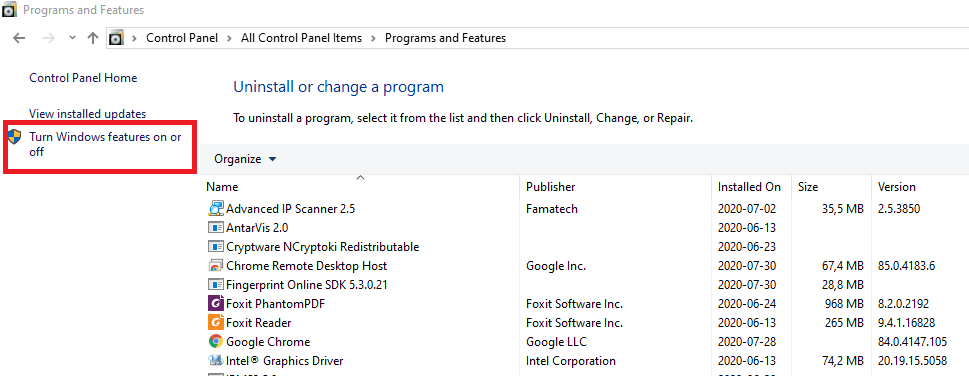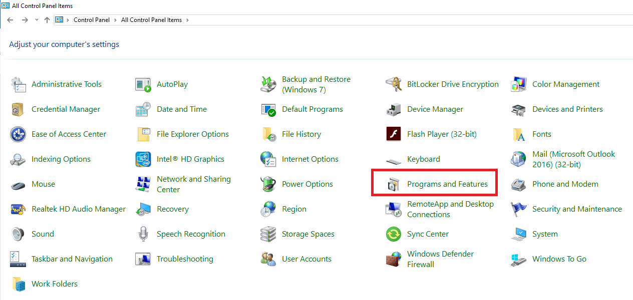 - Trước tiên, mở Programs and Features trong phần Control Panel: