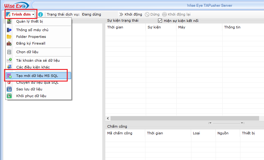 - Mặc định khi cài đặt phần mềm xong sẽ sử dụng database là Access - Phần mềm sẽ cho tùy chọn thêm dữ liệu Microsoft SQL Server (nếu sử dụng máy chấm công Face thế hệ mới nên sử dụng data SQL)- Vào Trình Đơn à Tạo mới dữ liệu MS SQL (Yêu cầu máy đã cài SQL server từ 2008 trở lên)