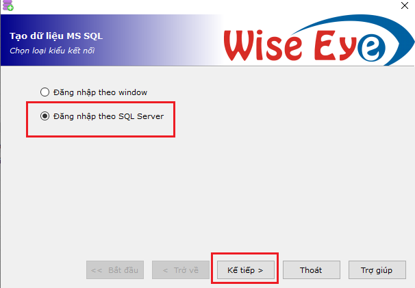 - Chọn đăng nhập theo SQL Server à bấm kế tiếp