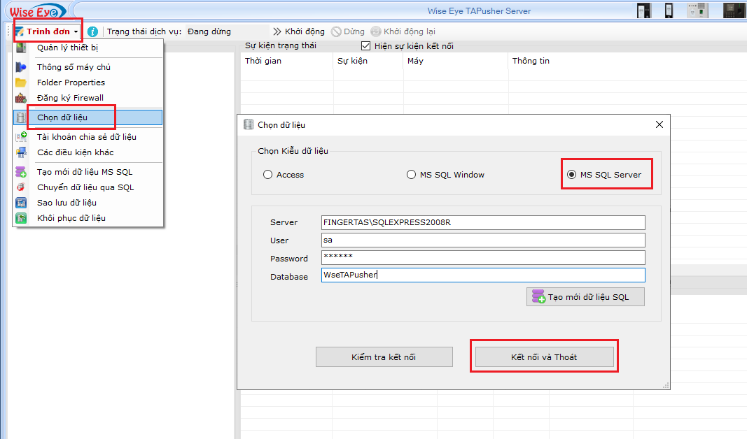 - Vào khai báo à chọn dữ liệu à chọn kiểu dữ liệu MS SQL Server à Nhập đầy đủ các thông số của SQL à Bấm Kết nối và thoát