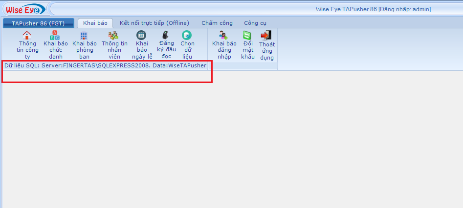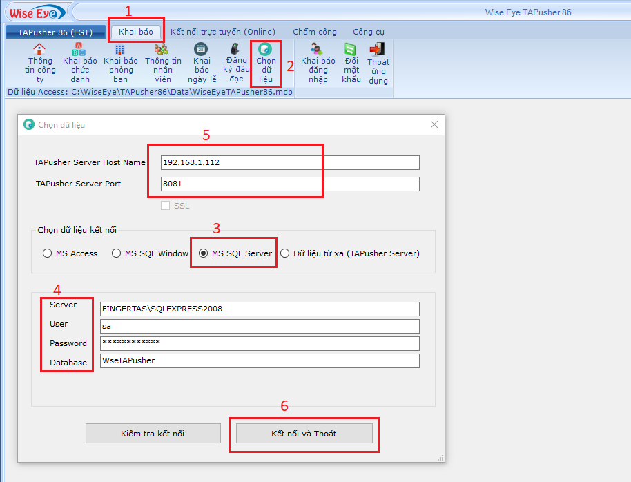 • Vào khai báo(1) à chọn dữ liệu (2) à chọn kiểu dữ liệu MS SQL Server (3) à Nhập đầy đủ các thông số của SQL (giống như đã nhập ở bên phần mềm WiseEyeTAPusherSerVer)