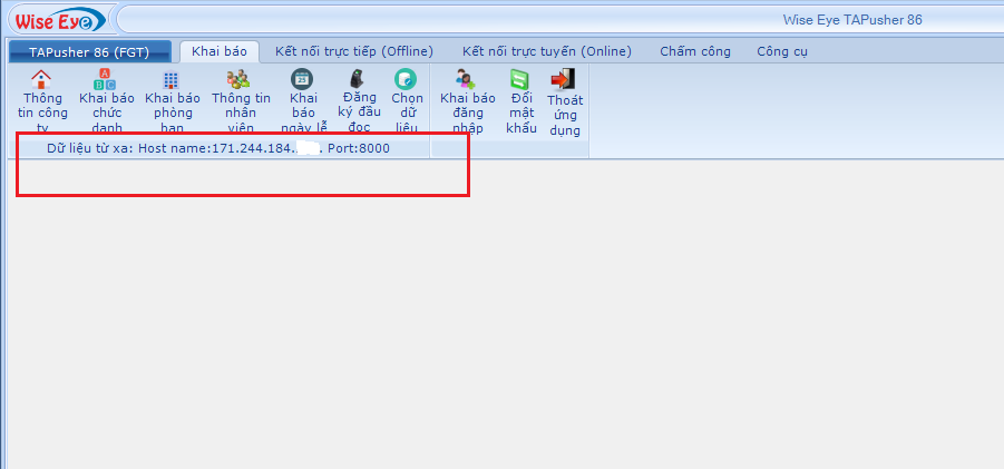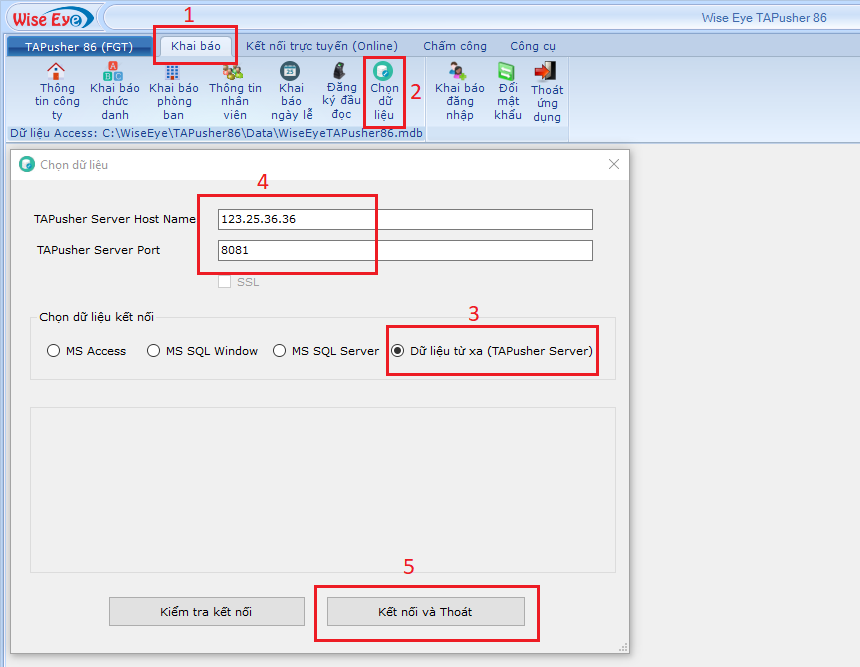 • Vào khai báo(1) à chọn dữ liệu (2) à Chọn Dữ liệu từ xa (TAPusher Server )(3) –> Nhập IP WAN và Port đã mở trên Router nơi cài phần mềm WiseEyeTAPusherSerVer (4) à Bấm Kết nối và thoát (5)