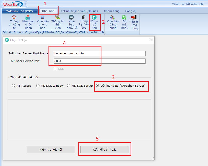 • Vào khai báo(1) à chọn dữ liệu (2) à Chọn Dữ liệu từ xa (TAPusher Server ) –> Nhập HostName và Port đã mở trên Router nơi cài phần mềm WiseEyeTAPusherSerVer(4) à Bấm Kết nối và thoát (5)