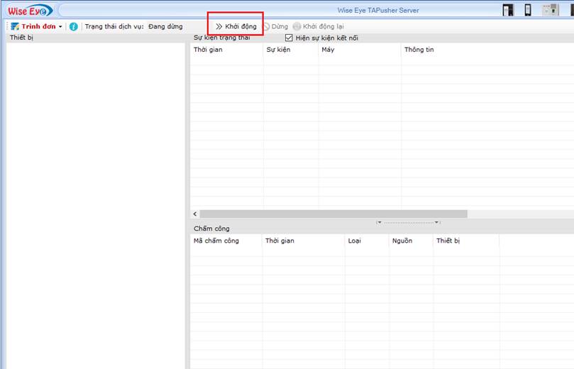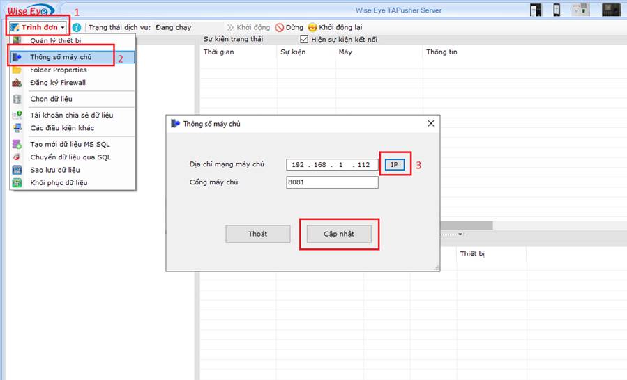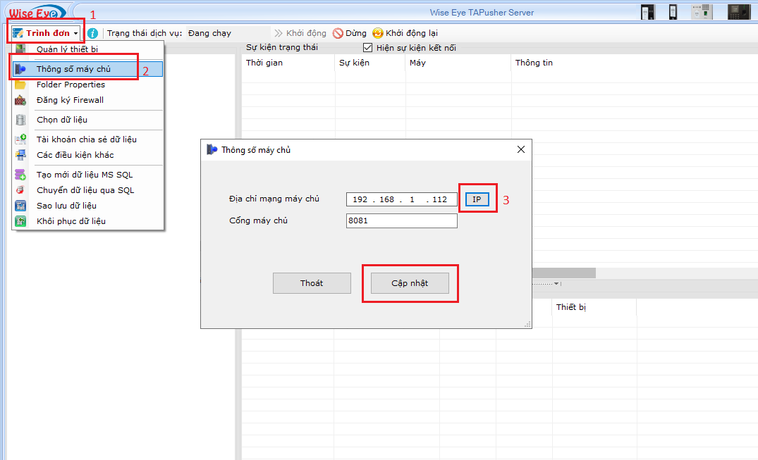 + Địa chỉ máy chủ : nhập IP máy tính cài phần mềm Wise Eye TAPusher Server