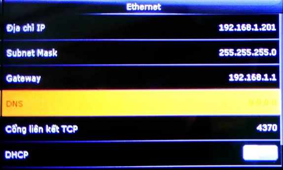 - Vào Menu à thiết lập liên kết à Ethenet: nhập địa chỉ IP, Subnet Mask, Default Getway