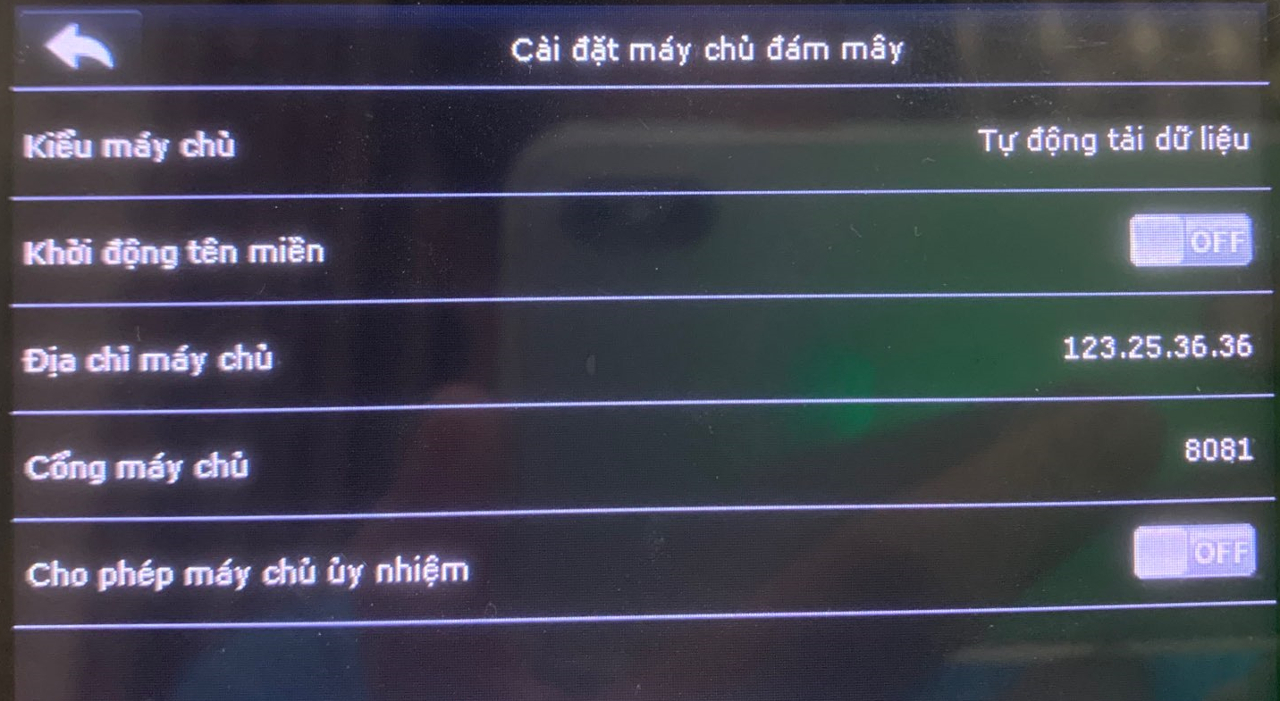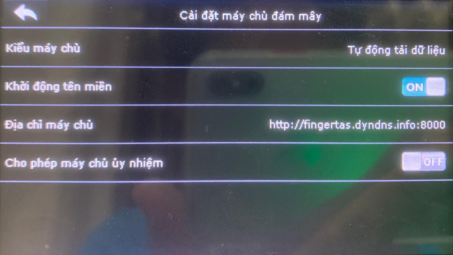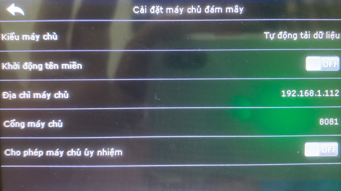 - Trên máy chấm công, mục cài đặt máy chủ đám mây sẽ điền như sau: