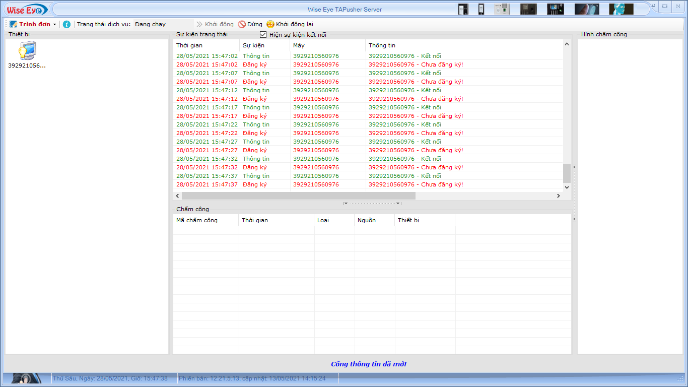 - Sau khi khai báo các thông số thành công thì số seri của máy chấm công sẽ lập tức chạy về Wise Eye TAPusher Server giống như hình sau: