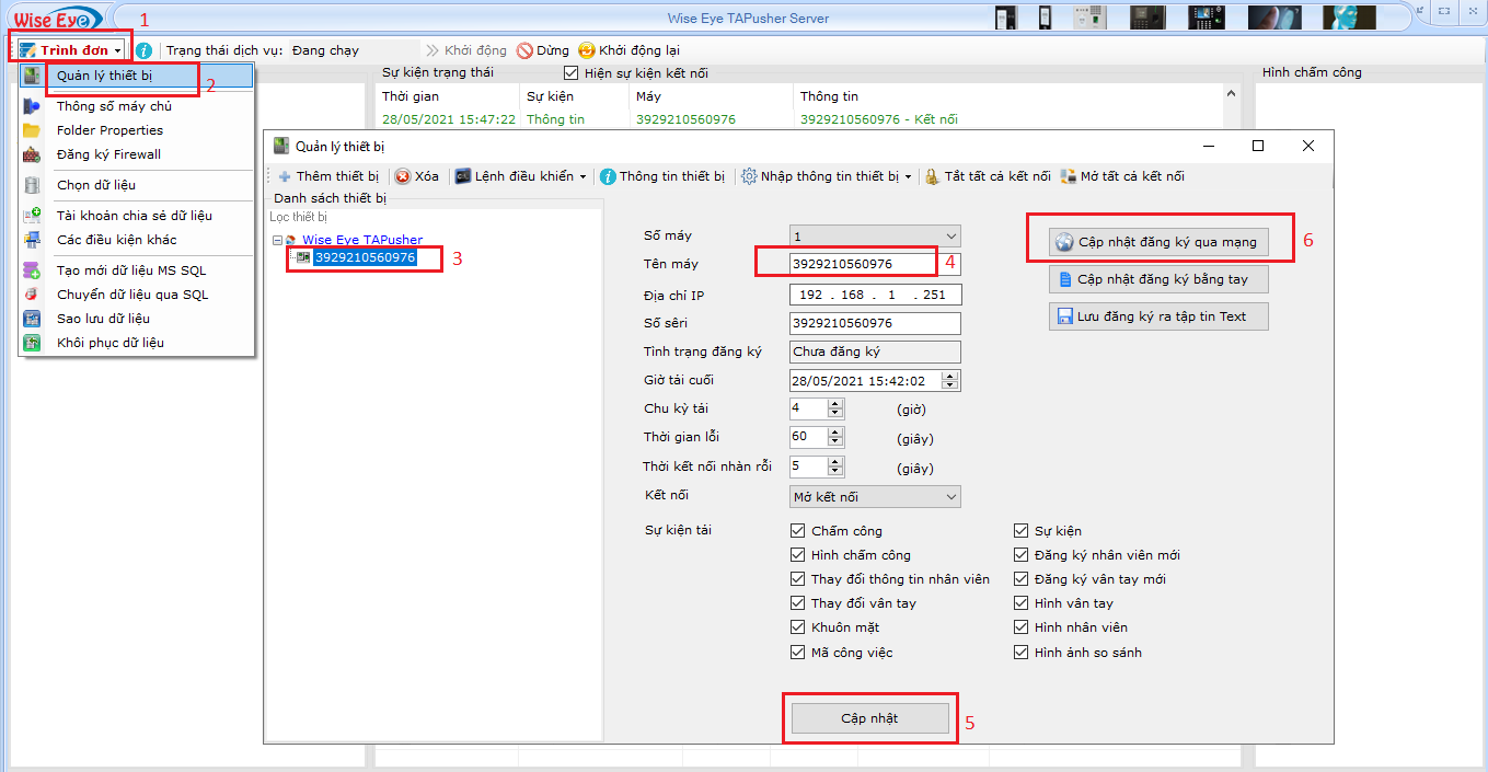 - Vào trình đơn(1) à Quản lý thiết bị(2) à Bấm vào số seri(3) à Nhập tên máy vào ô tên máy(4) à Bấm Cập nhật(5) để lưu lại à Bấm Cập nhật đăng ký qua mạng(6) để đăng ký máy chấm công