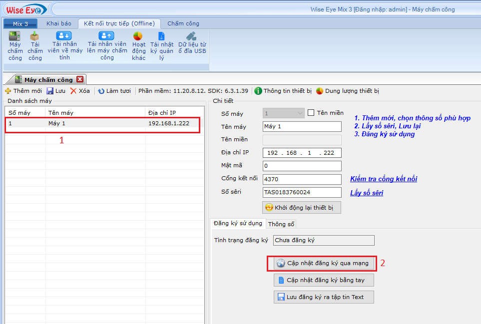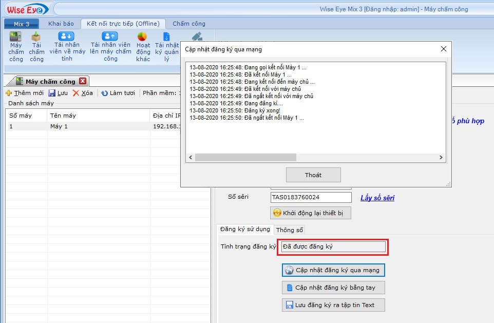 Sau khi khai báo máy chấm công thành công thì bấm cập nhật đăng ký qua mạng