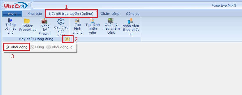 Vào (1) Kết nối trực tuyến(online) (2) bấm vào mũi tên dịch vụ (3) Bấm khởi động
