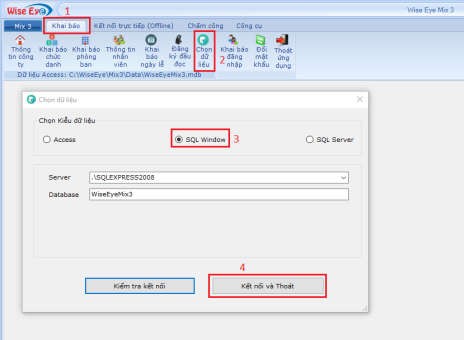 Mở phần mềm lên => Vào (1) khai báo => (2) chọn dữ liệu => (3) chọn kiểu dữ liệu SQL Window => (4) bấm kết nối và thoát
