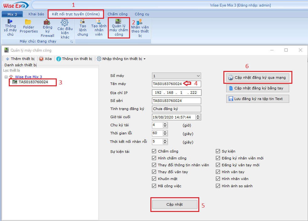 Vào (1) Kết nối trực tuyến(online) =>(2) Quản lý máy chấm công =>(3) Chọn máy cần đăng ký => (4) Nhập tên máy => (5) Bấm cập nhật => (6) Bấm cập nhật đăng ký qua mạng