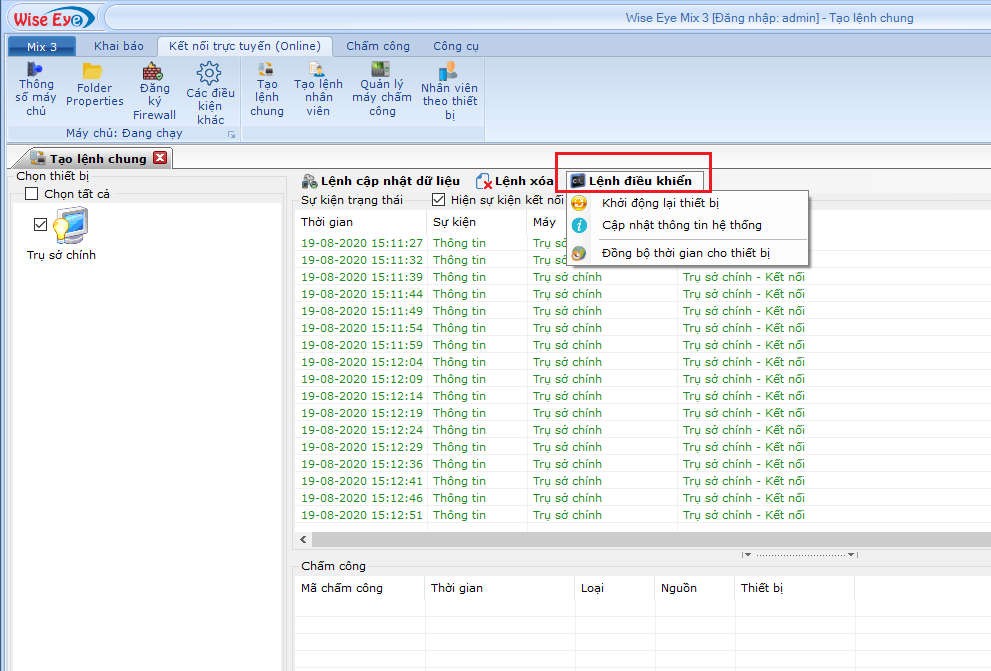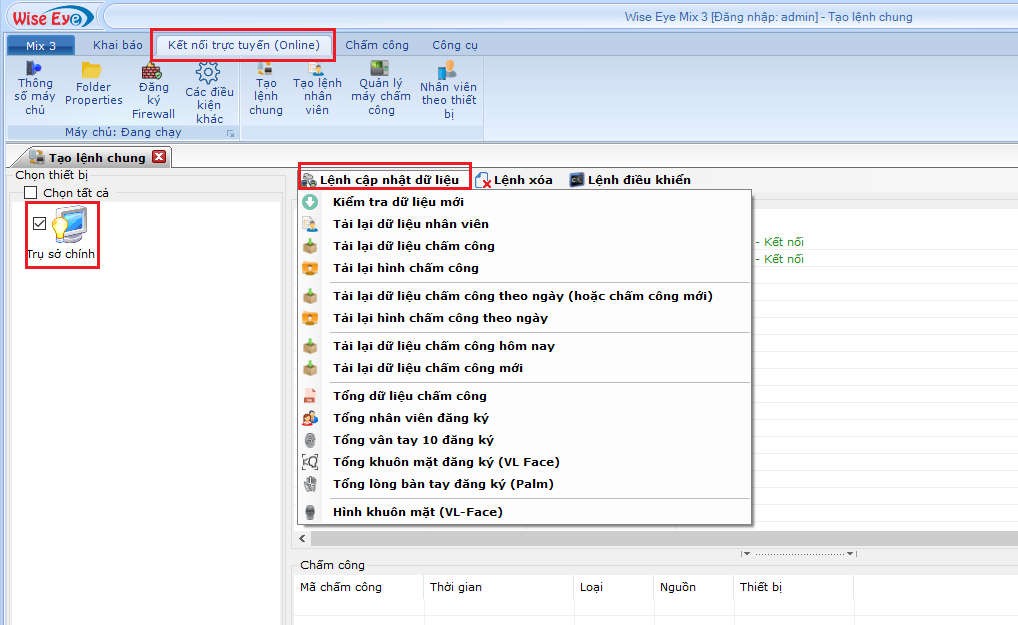 Vào Kết nối trực tuyến(online) => chọn máy cần tải dữ liệu => chọn Tab Lệnh cập nhật dữ liệu : cần tải dữ liệu nào thì bấm vào mục đó