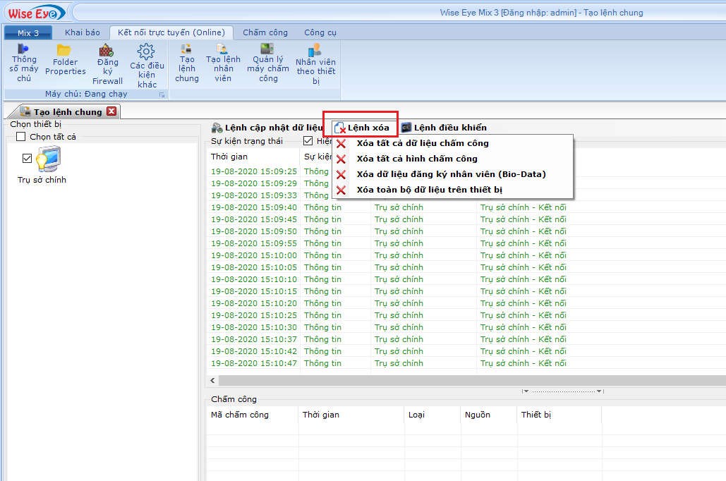 Vào Kết nối trực tuyến(online) => chọn máy cần xóa dữ liệu => chọn Tab Lệnh xóa : cần xóa dữ liệu nào thì bấm vào mục đó